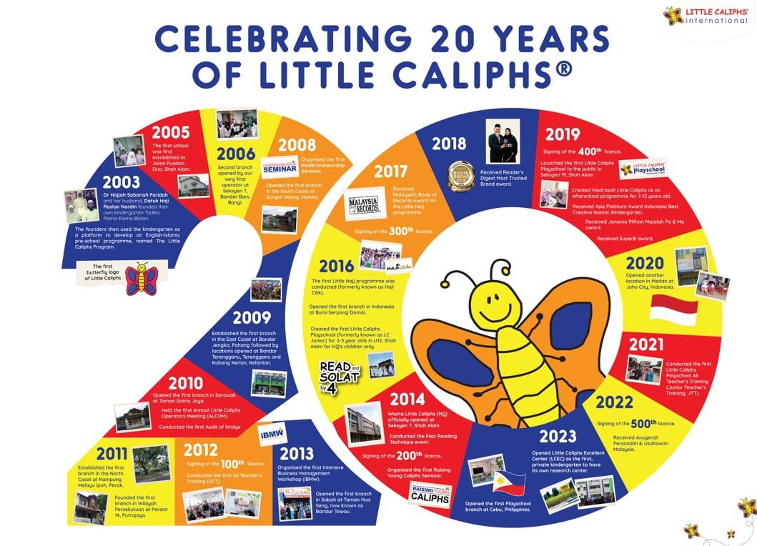 Backed by her many years of active training and consultancy on early childhood education, the founders used the new kindergarten as a platform to design, develop, and test a new pre-school program, namely The Little Caliphs® Program (TLCP).